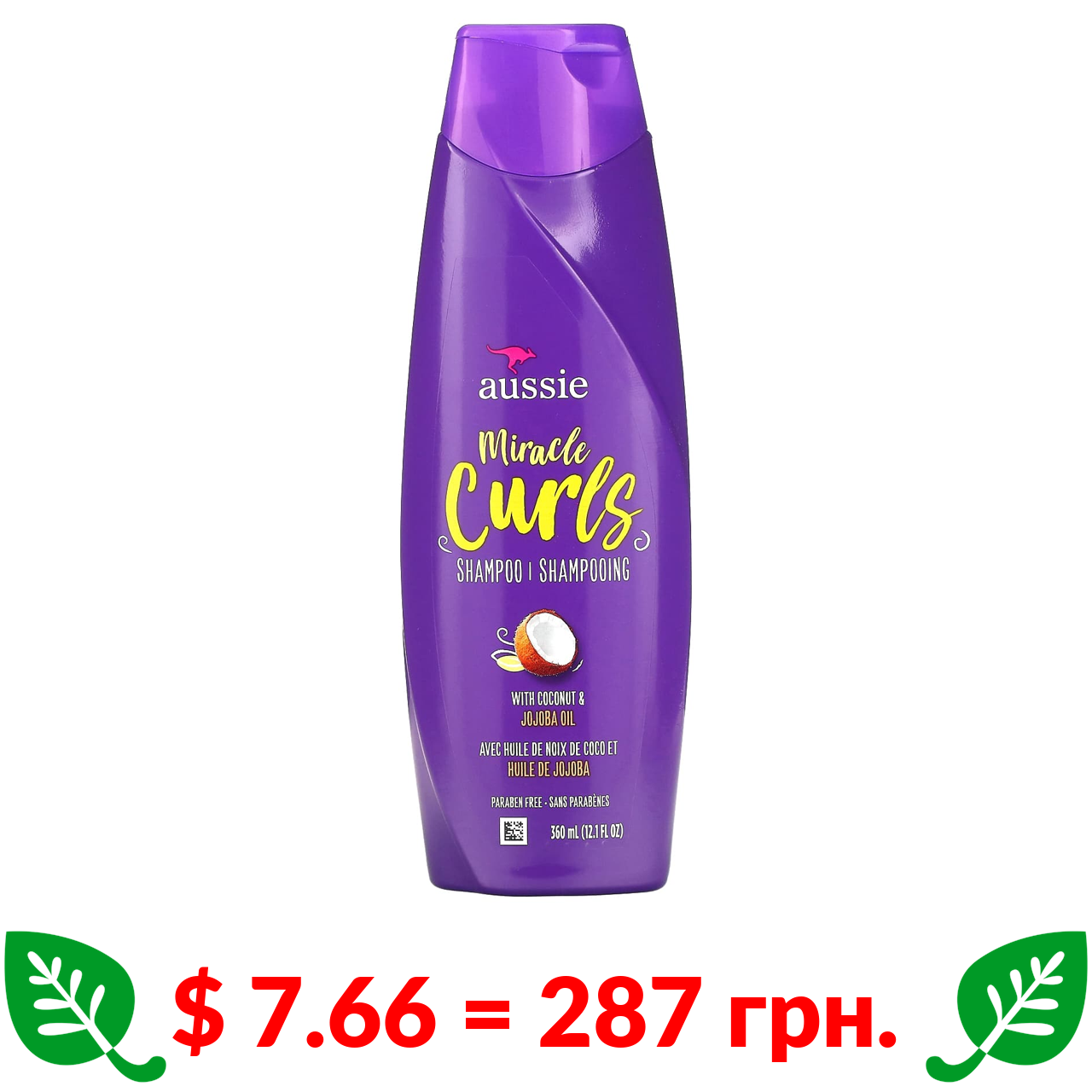 $ 7.66 = 287 грн. Aussie, Miracle Curls, шампунь з кокосовою олією та олією австралійського жожоба, 360 мл (12,1 рідк. унції)