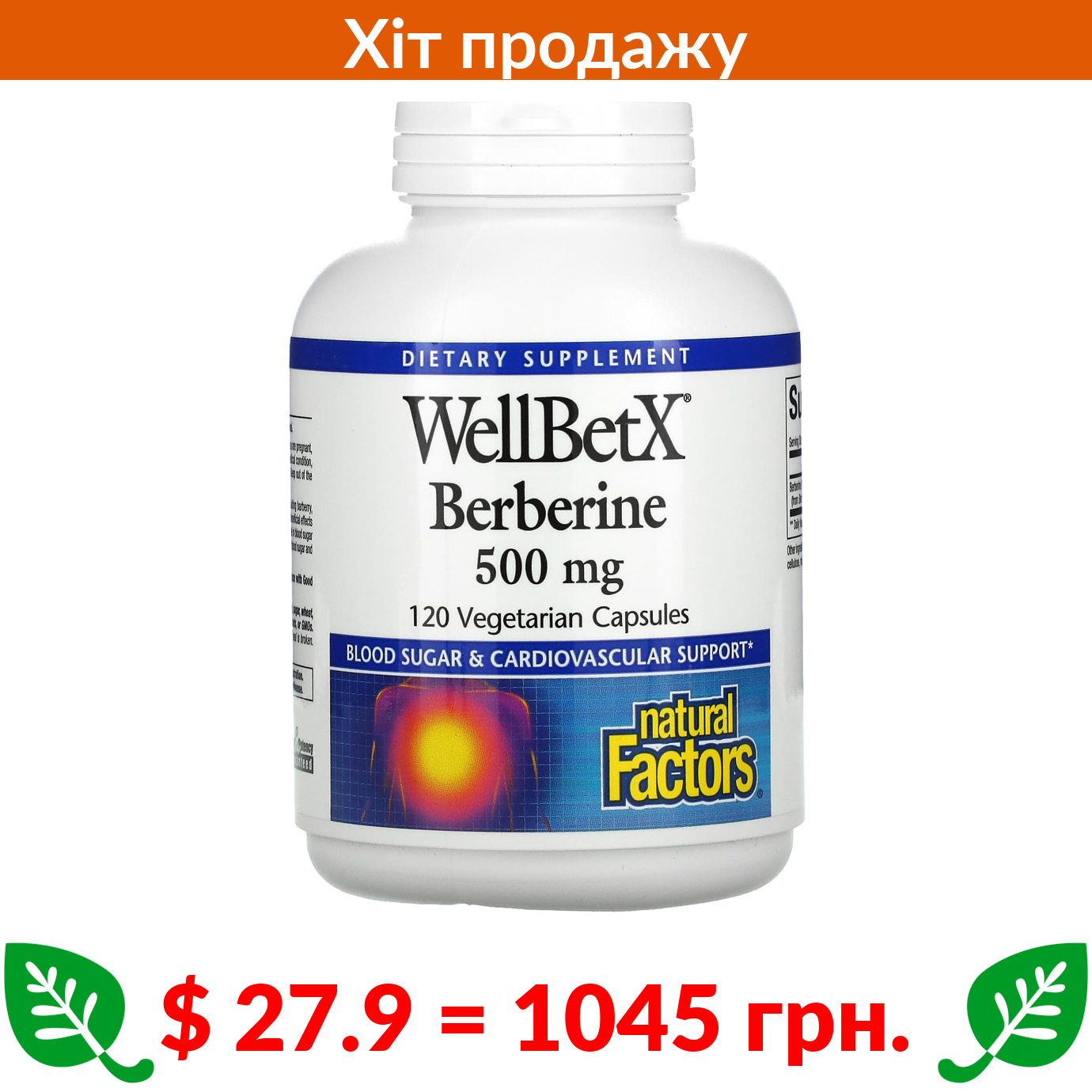 $ 27.9 = 1045 грн. Natural Factors, WellBetX, берберин, 500 мг, 120 вегетаріанських капсул