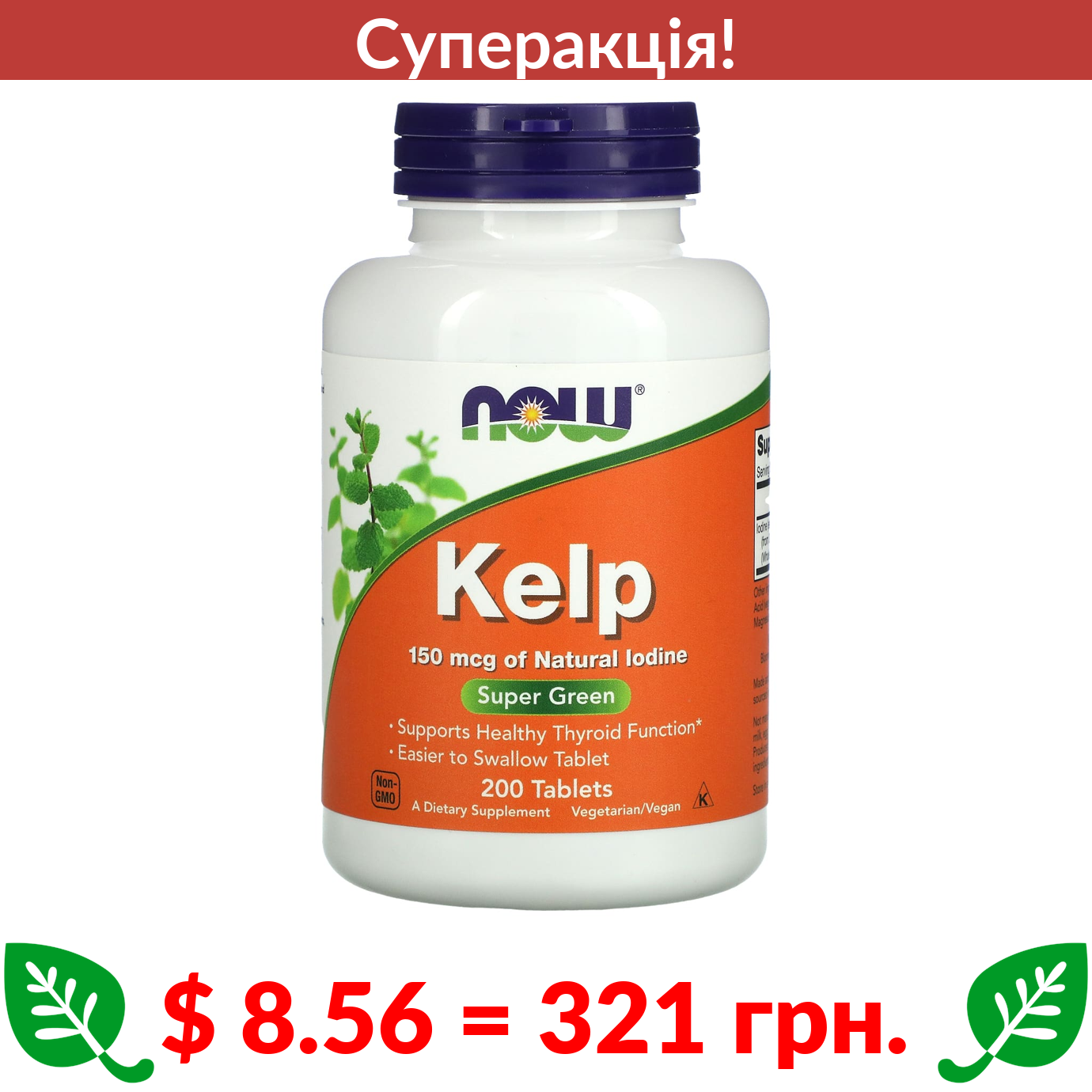 $ 8.56 = 321 грн. ???? cуперакція! ???? Now Foods, бурі водорості, 150 мкг, 200 таблеток