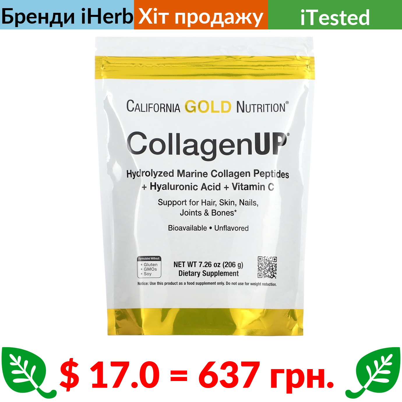 $ 17.0 = 637 грн. California Gold Nutrition, CollagenUP, пептиди гідролізованого морського колагену з гіалуроновою кислотою та вітаміном C, без смакових добавок, 206 г (7,26 унції)