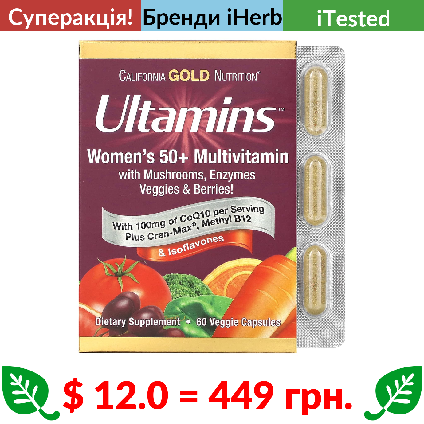 $ 12.0 = 449 грн. ???? cуперакція! ???? California Gold Nutrition, Ultamins, мультивітаміни для жінок старше 50 років із коензимом Q10, гриби, ферменти, овочі та ягоди, 60 вегетаріанських капсул