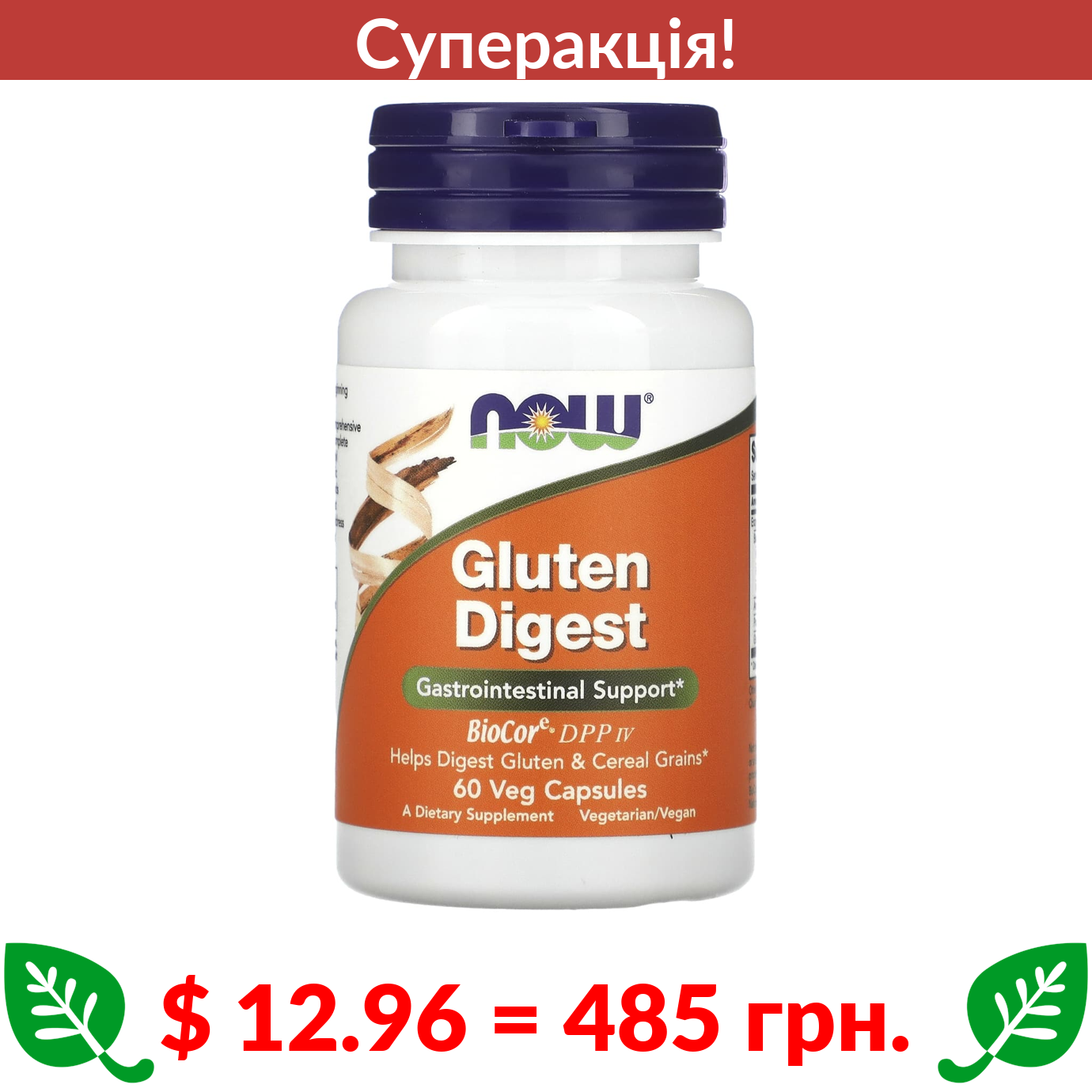 $ 12.96 = 485 грн. ???? cуперакція! ???? Now Foods, Gluten Digest, добавка для перетравлювання глютену, 60 рослинних капсул