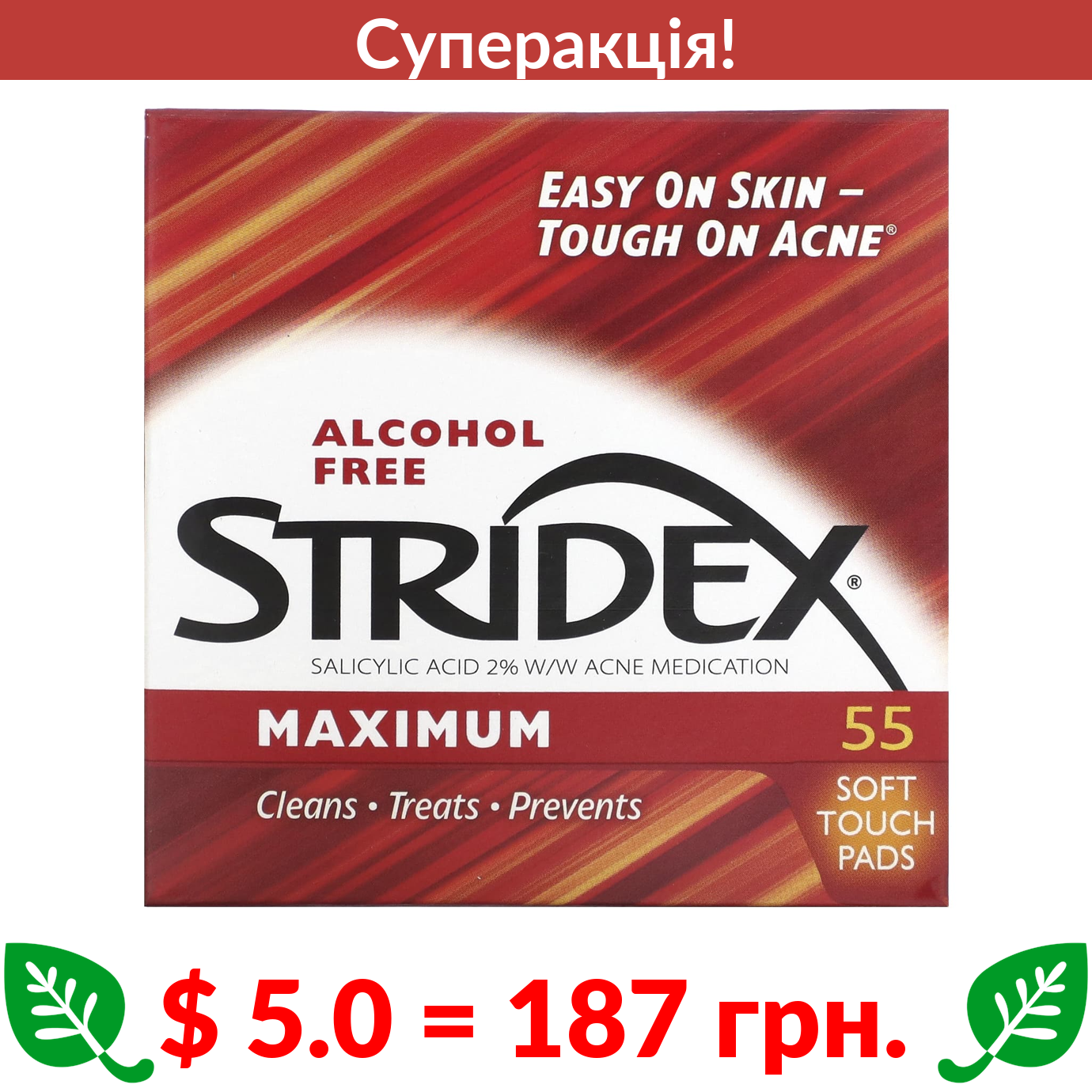 $ 5.0 = 187 грн. ???? cуперакція! ???? Stridex, Single-Step, контроль акне, максимальна дія, без спирту, 55 м’яких подушечок