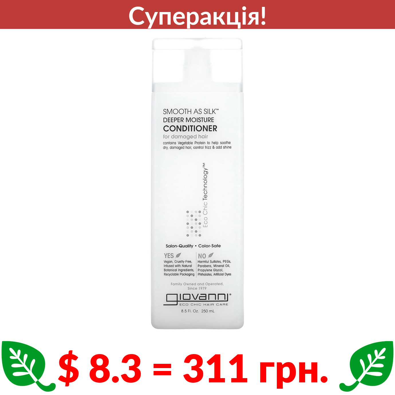 $ 8.3 = 311 грн. ???? cуперакція! ???? Giovanni, Smooth As Silk, кондиціонер для глибокого зволоження волосся, для пошкодженого волосся, 250 мл (8,5 рідк. унцій)
