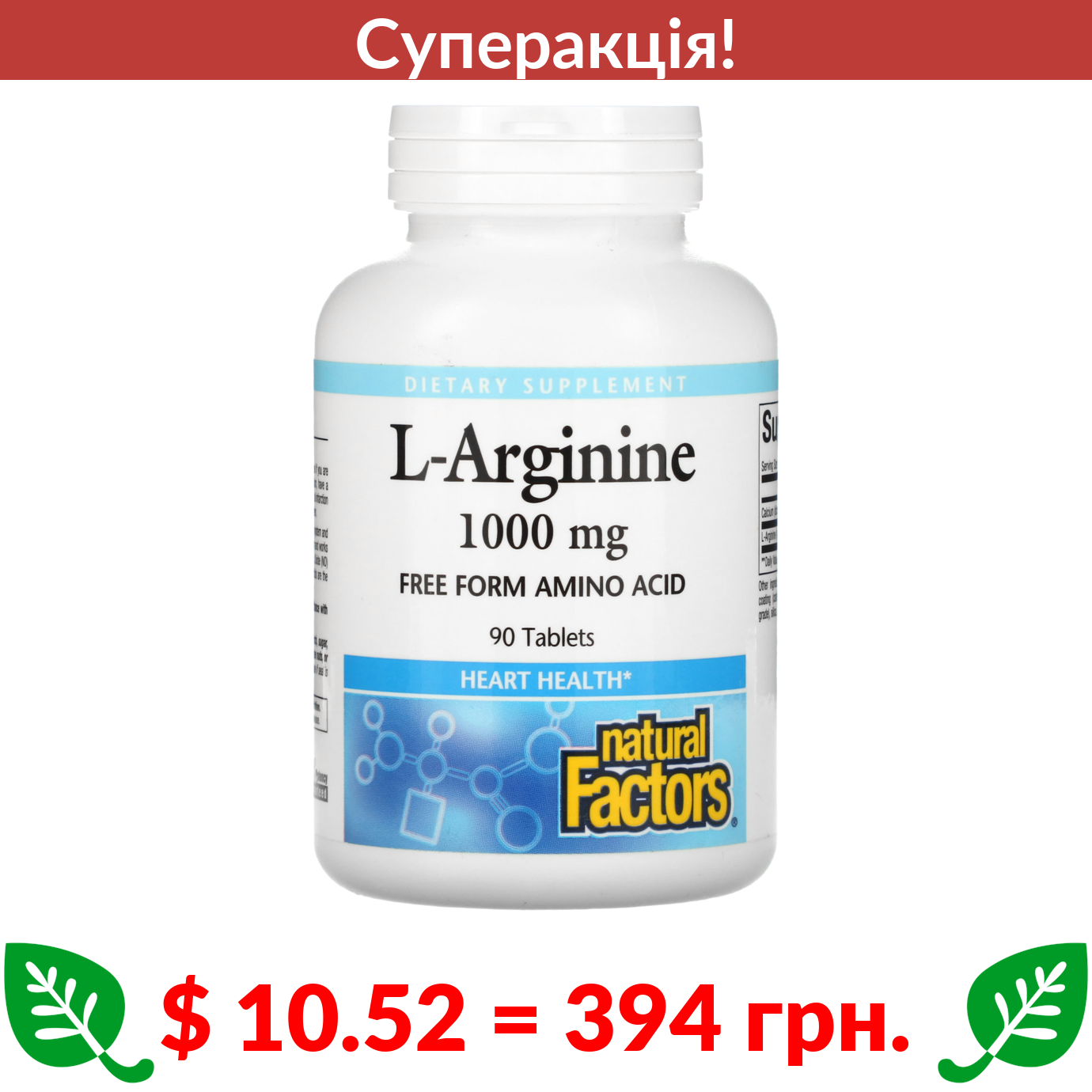 $ 10.52 = 394 грн. ???? cуперакція! ???? Natural Factors, L-аргінін, 1000 мг, 90 таблеток