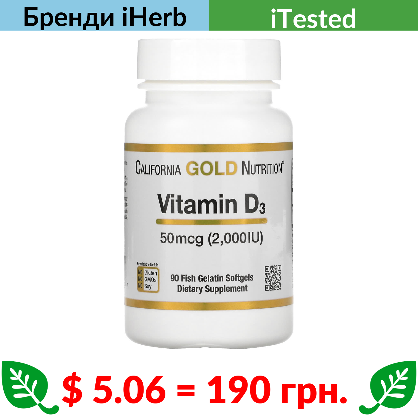 $ 5.06 = 190 грн. California Gold Nutrition, вітамін D3, 50 мг (2000 МО), 90 капсул із риб’ячого желатину