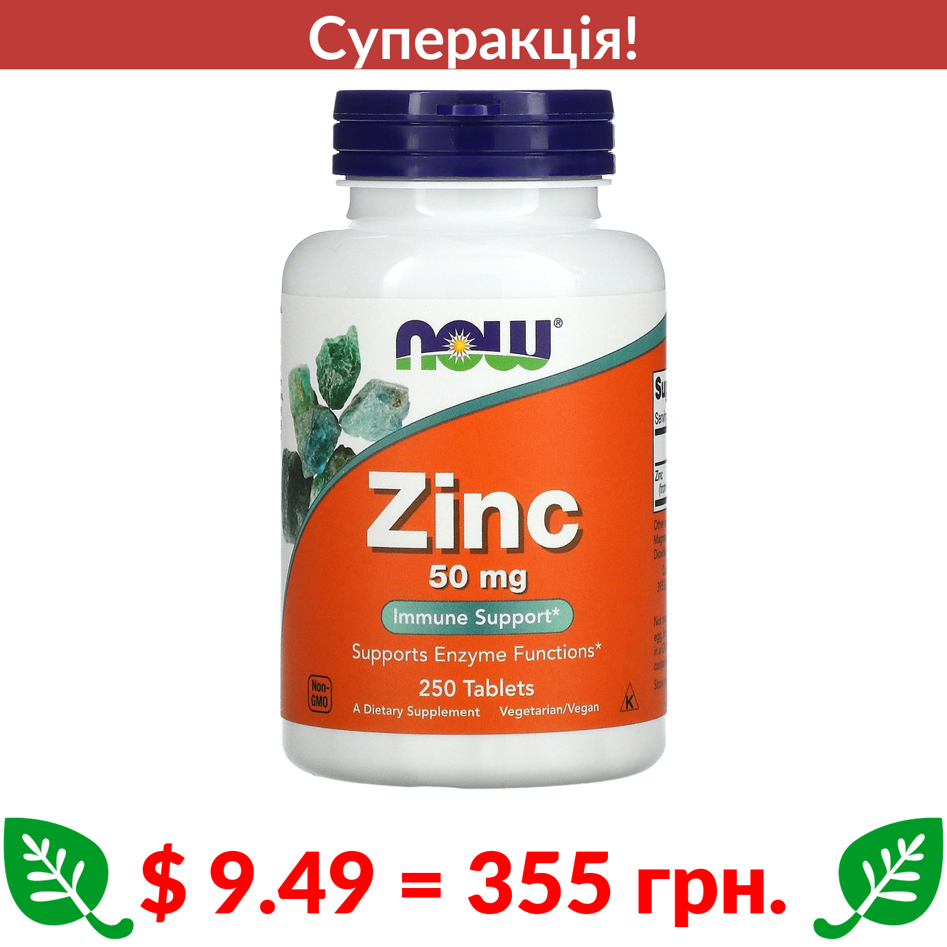 $ 9.49 = 355 грн. ???? cуперакція! ???? Now Foods, цинк, 50 мг, 250 таблеток