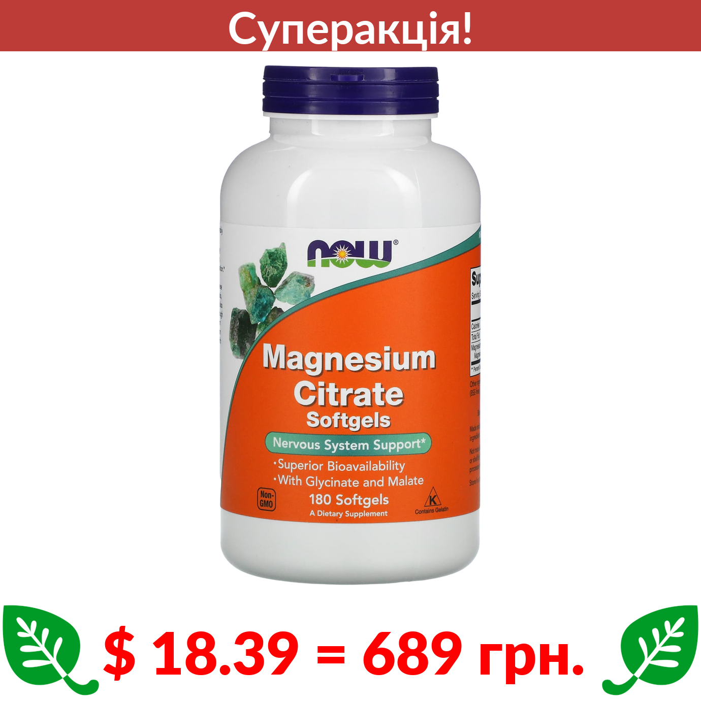 $ 18.39 = 689 грн. ???? cуперакція! ???? Now Foods, цитрат магнію, 180 капсул