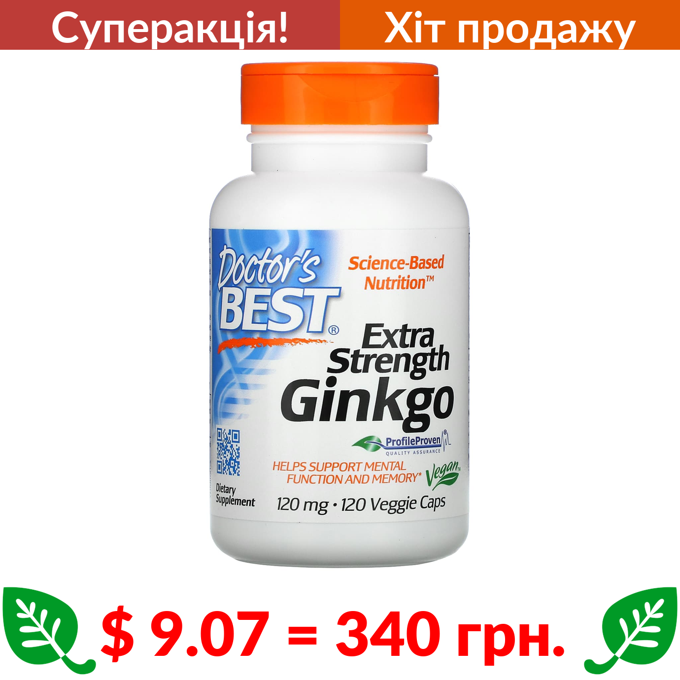 $ 9.07 = 340 грн. ???? cуперакція! ???? Doctor’s Best, гінкго білоба з підвищеною силою дії, 120 мг, 120 вегетаріанських капсул