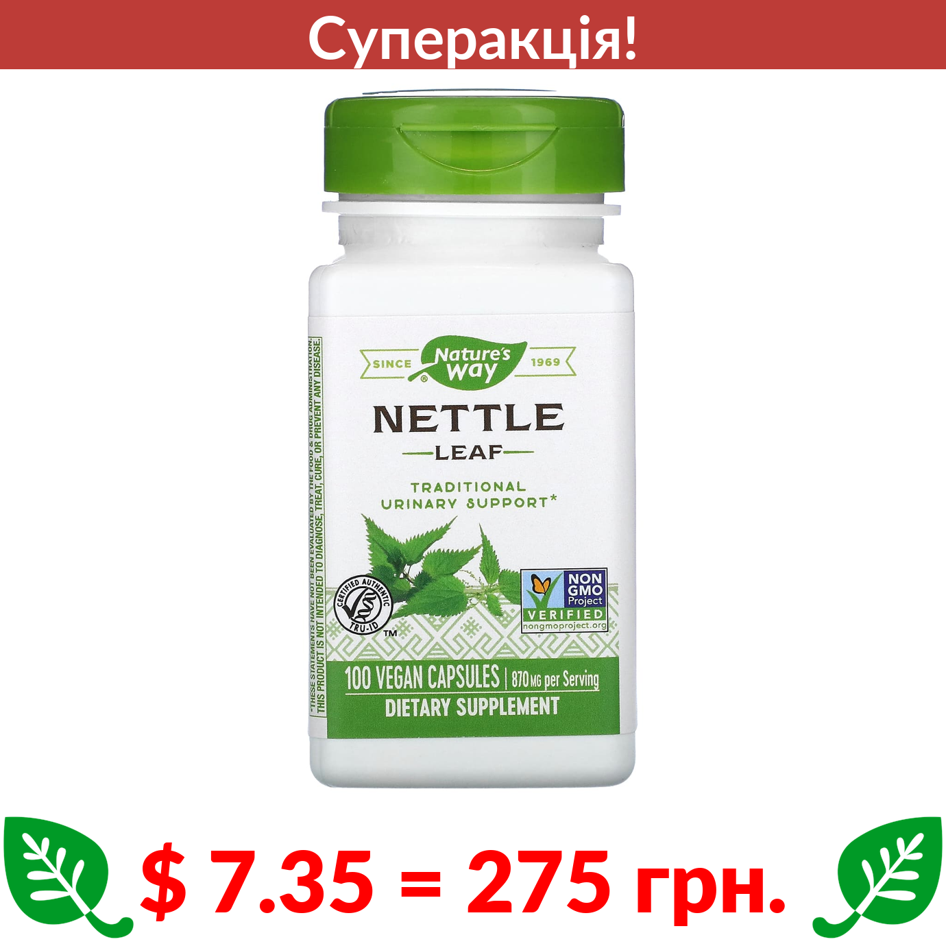 $ 7.35 = 275 грн. ???? cуперакція! ???? Nature’s Way, листя кропиви, 435 мг, 100 веганських капсул
