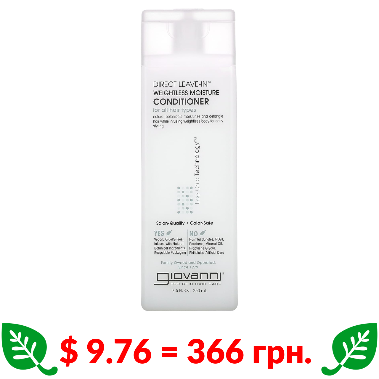 $ 9.76 = 366 грн. Giovanni, Direct Leave-In, кондиціонер для невагомого зволоження, для всіх типів волосся, 250 мл (8,5 рідк. унцій)