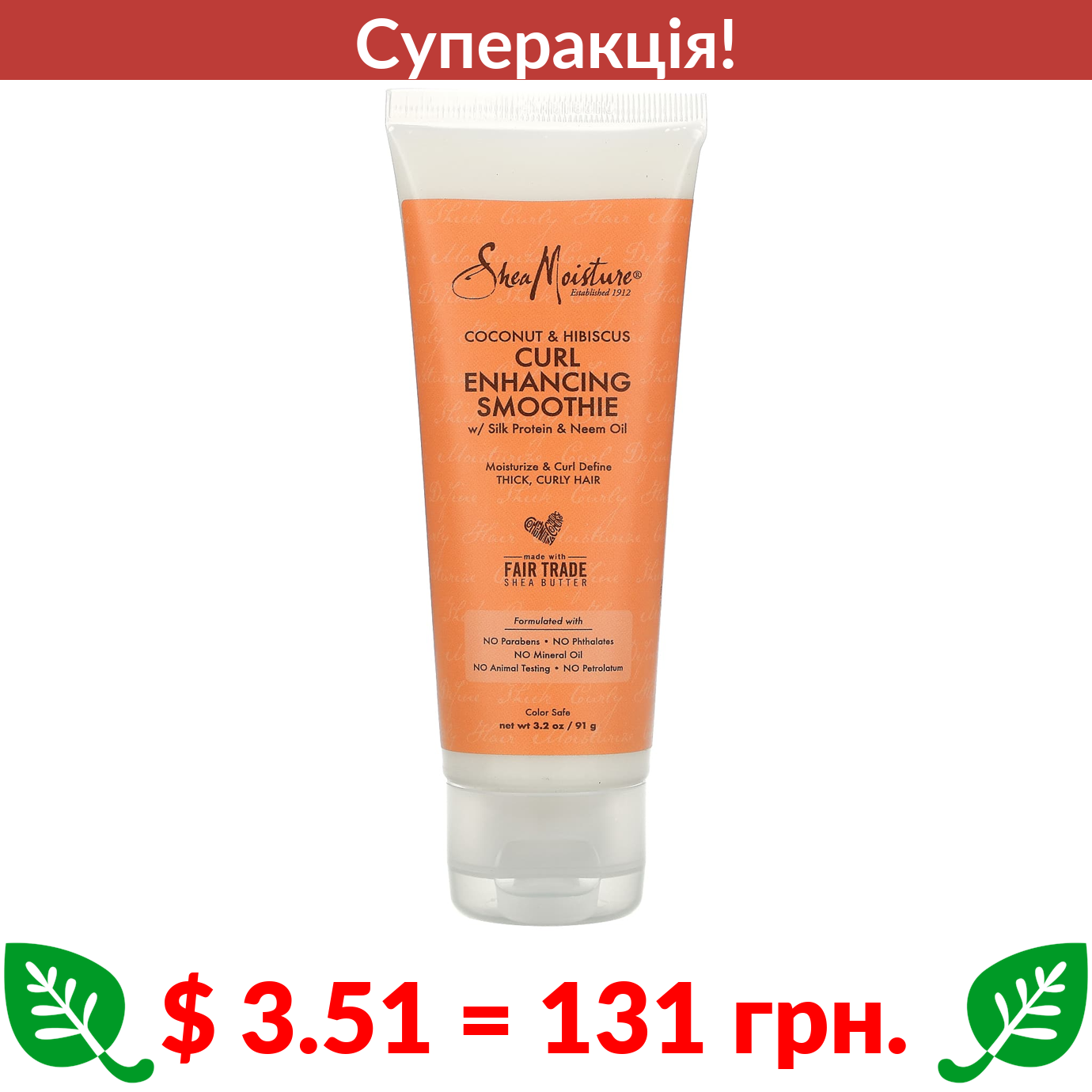 $ 3.51 = 131 грн. ???? cуперакція! ???? SheaMoisture, смузі для локонів з протеїнами шовку та олією німу, кокосом та гібіскусом, 91 г (3,2 унції)