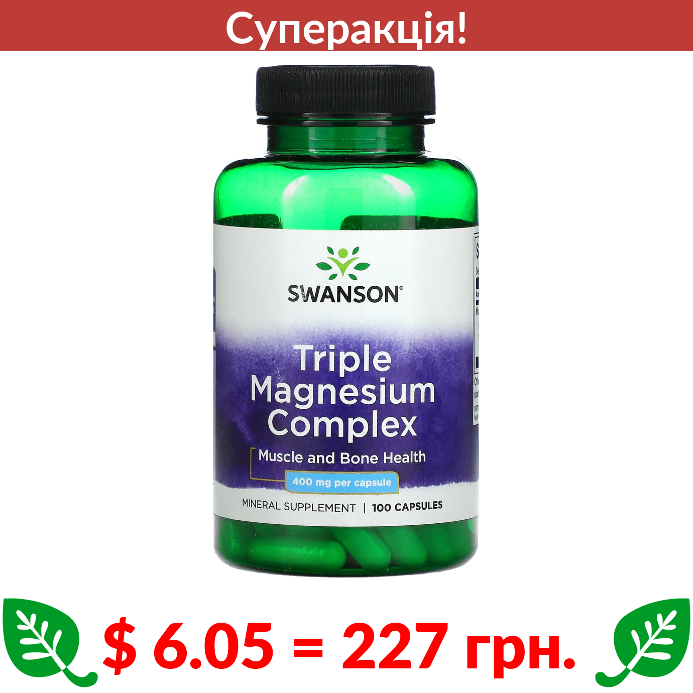 $ 6.05 = 227 грн. ???? cуперакція! ???? Swanson, комплекс з потрійним магнієм, 400 мг, 100 капсул