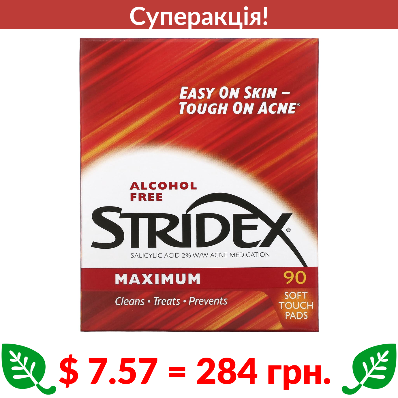 $ 7.57 = 284 грн. ???? cуперакція! ???? Stridex, Single-Step, контроль акне, максимальна дія, без спирту, 90 м’яких подушечок