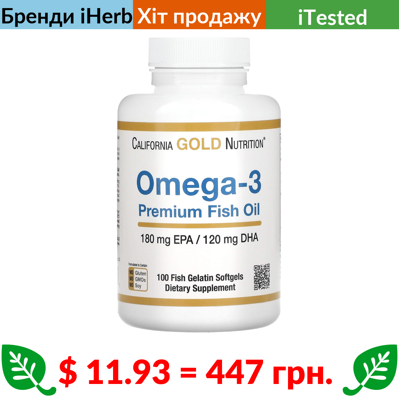 $ 11.93 = 447 грн. California Gold Nutrition, омега-3, риб’ячий жир преміальної якості, 180 мг ЕПК / 120 мг ДГК, 100 капсул із риб’ячого желатину