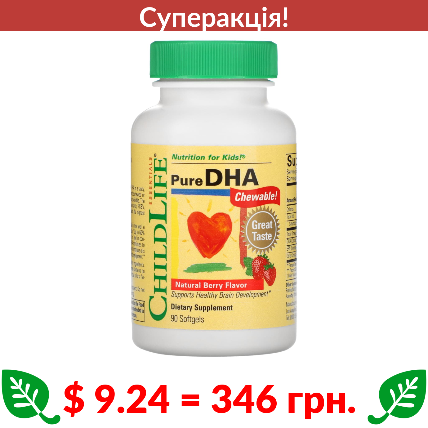 $ 9.24 = 346 грн. ???? cуперакція! ???? ChildLife Essentials, чиста ДГК, зі смаком натуральних ягід, 90 капсул