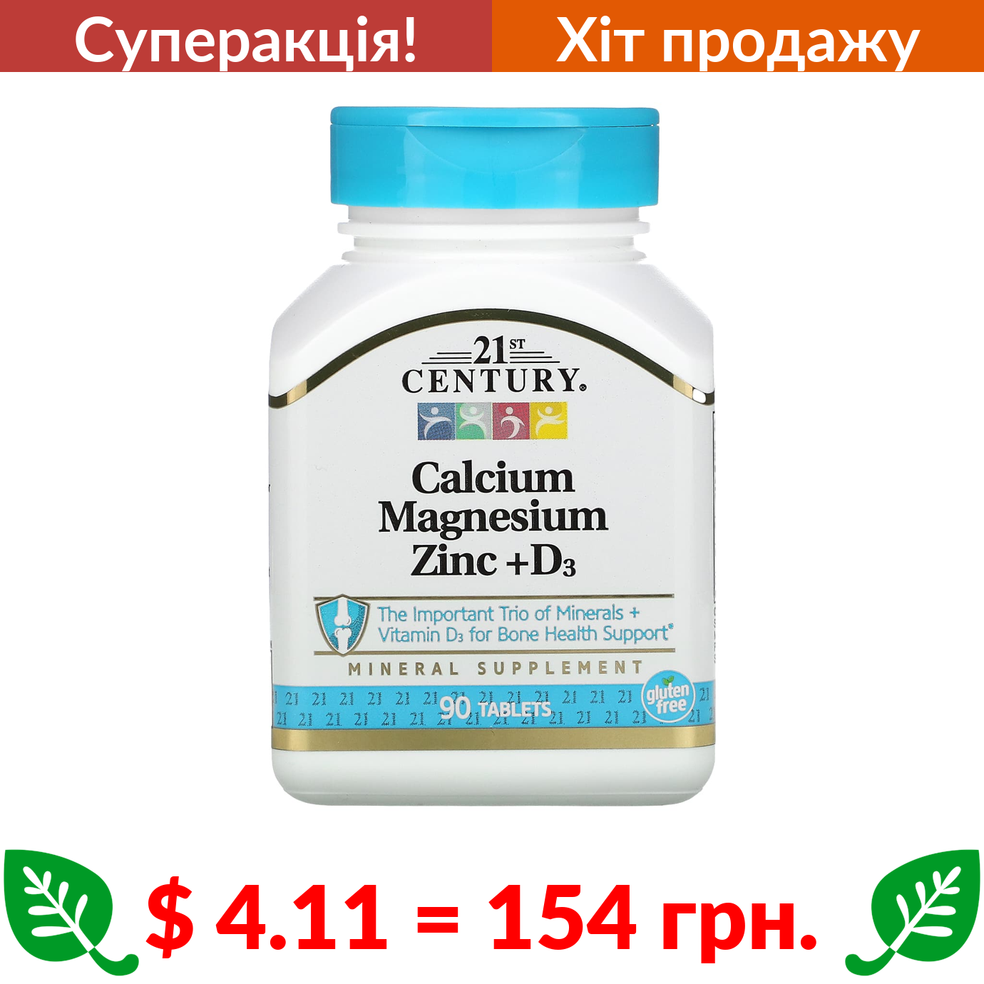 $ 4.11 = 154 грн. ???? cуперакція! ???? 21st Century, кальцій, магній, цинк і вітамін D3, 90 таблеток