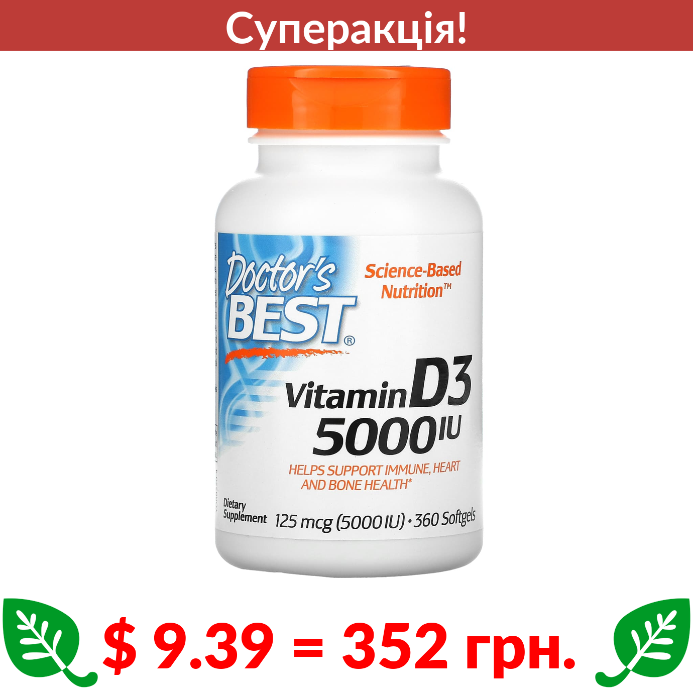 $ 9.39 = 352 грн. ???? cуперакція! ???? Doctor’s Best, вітамін D3, 125 мкг (5000 МО), 360 капсул