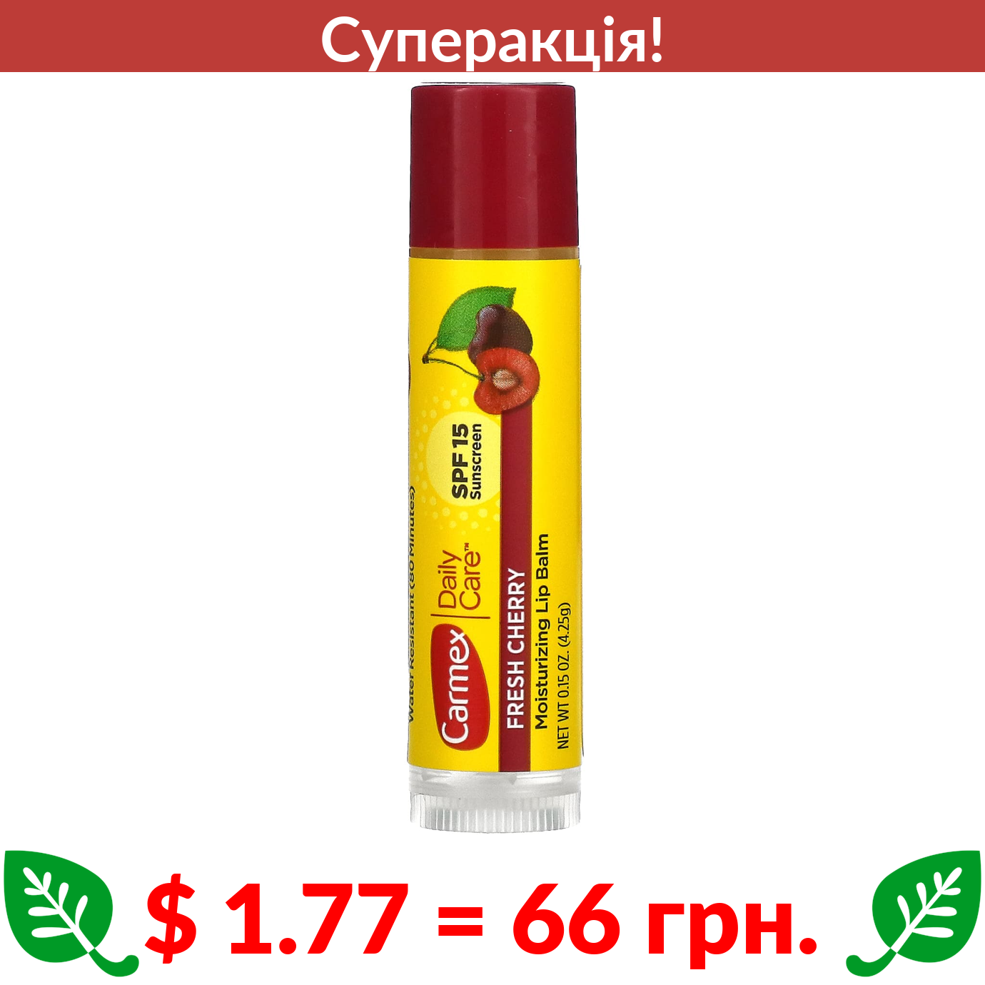$ 1.77 = 66 грн. ???? cуперакція! ???? Carmex, Daily Care, зволожуючий бальзам для губ, свіжа вишня SPF 15, 4,25 г (0,15 унції)
