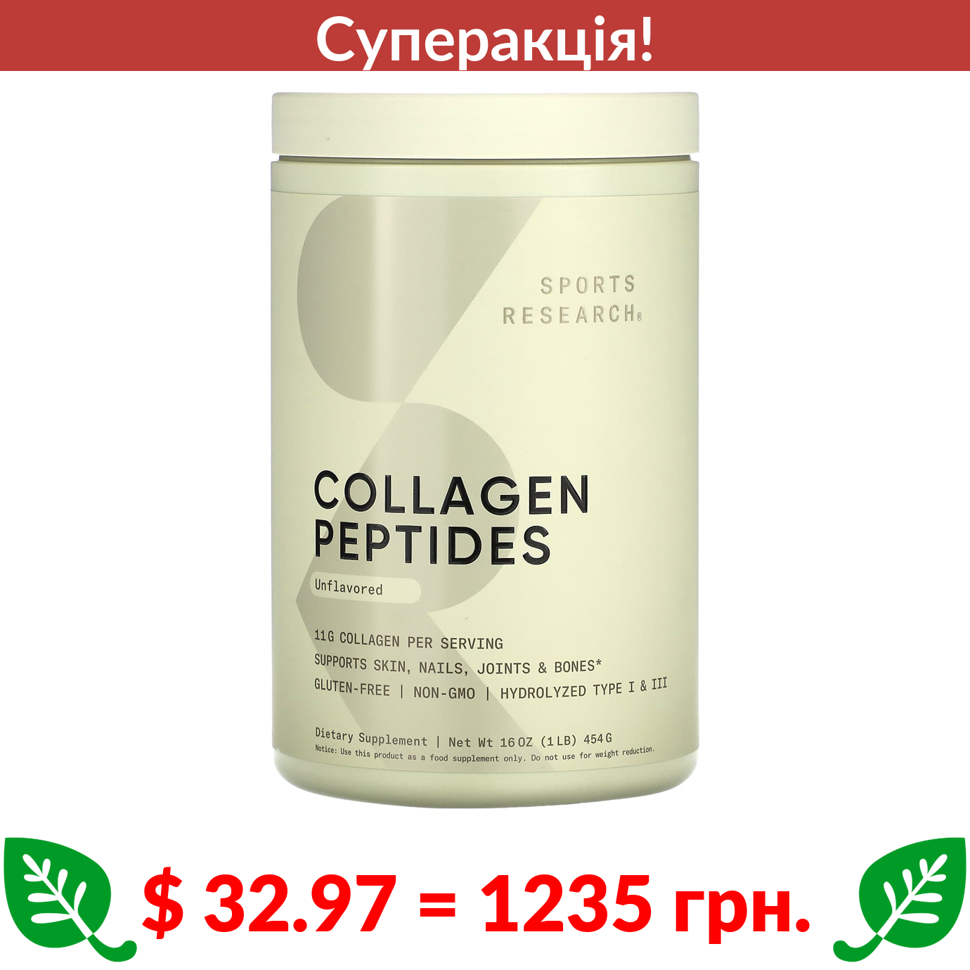 $ 32.97 = 1235 грн. ???? cуперакція! ???? Sports Research, пептиди колагену, з нейтральним смаком, 454 г (16 унцій)