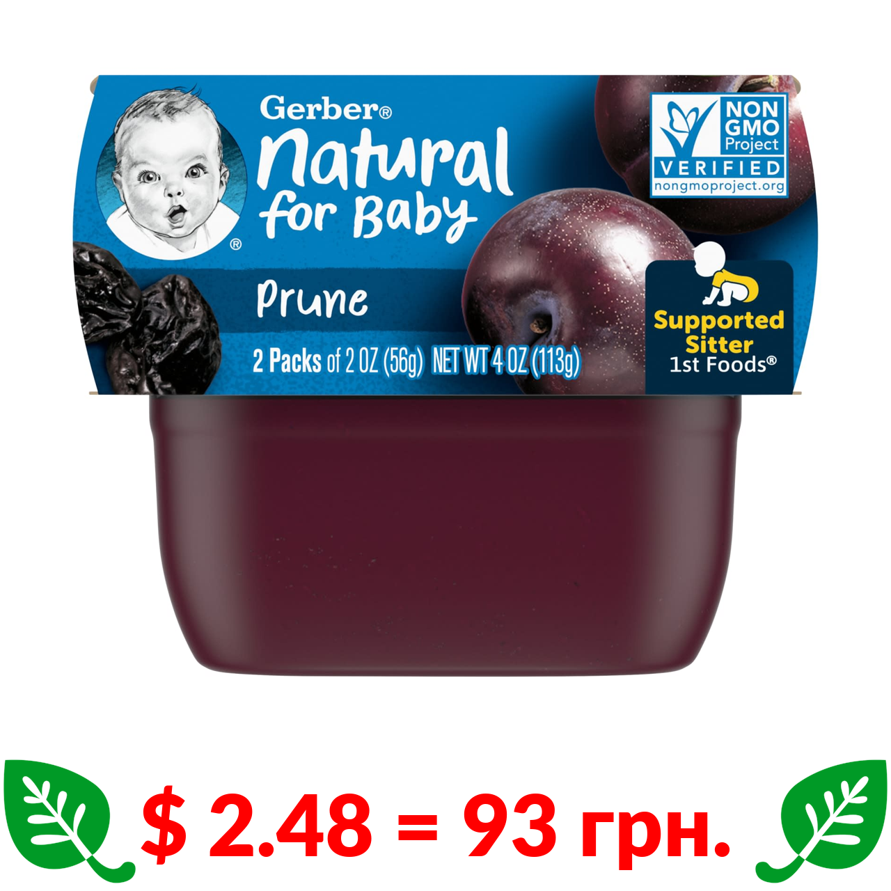$ 2.48 = 93 грн. Gerber, чорнослив, 2 баночки в упаковці, по 56 г (2 унції) кожна