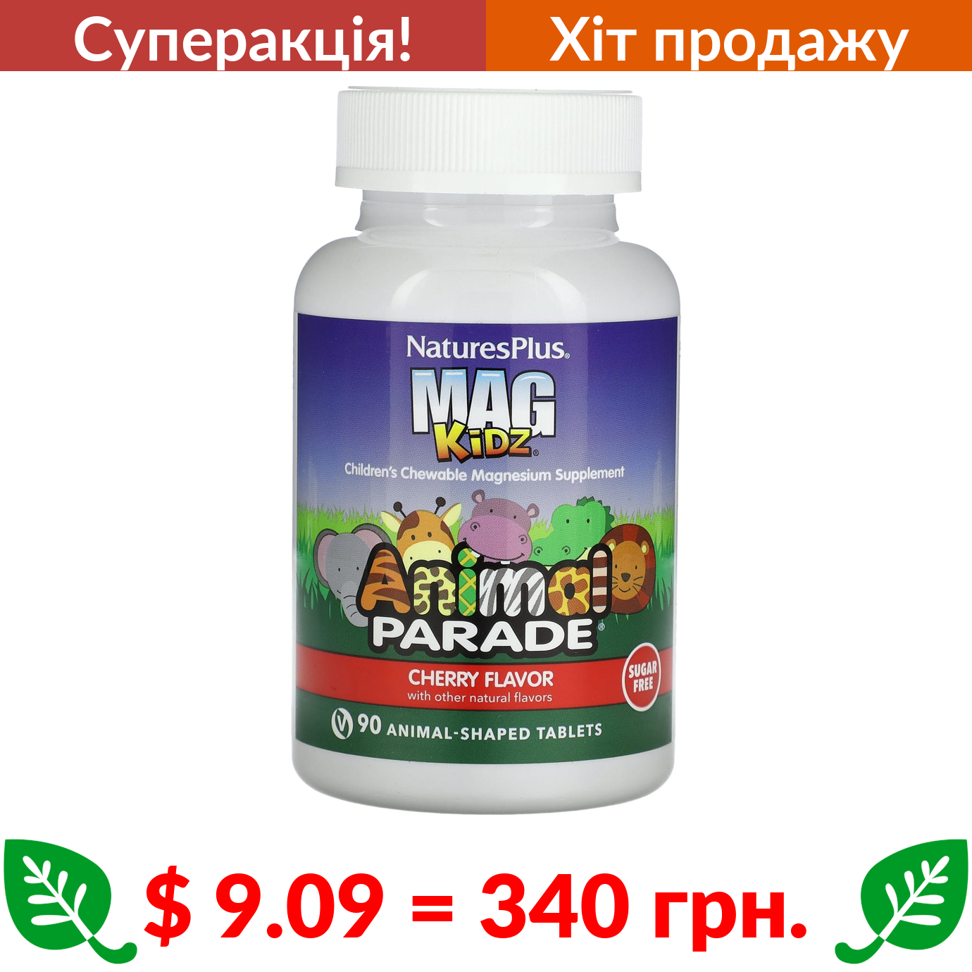 $ 9.09 = 340 грн. ???? cуперакція! ???? Nature’s Plus, MagKidz, Animal Parade, жувальні таблетки з магнієм для дітей, вишня, 90 таблеток у формі тварин