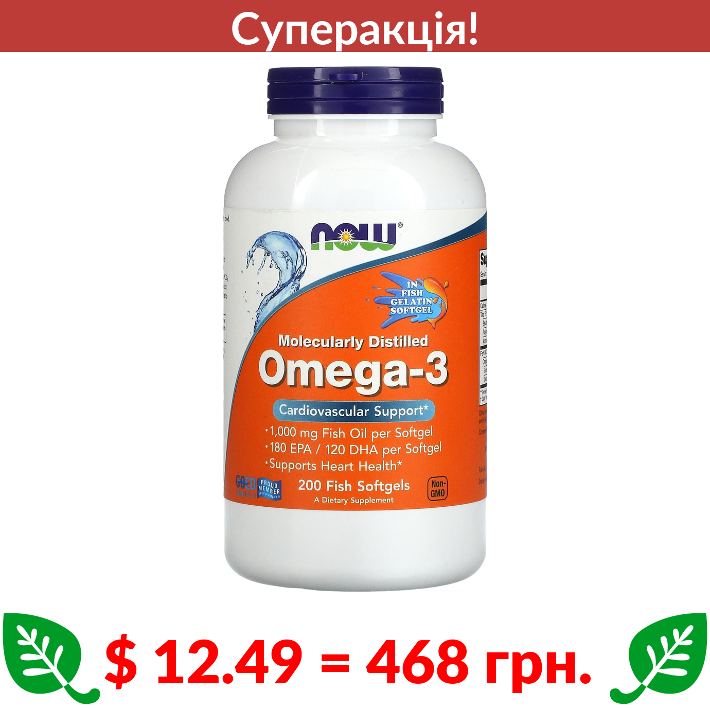 $ 12.49 = 468 грн. ???? cуперакція! ???? Now Foods, омега-3, 180 мг ЕПК / 120 мг ДГК, 200 рибних капсул