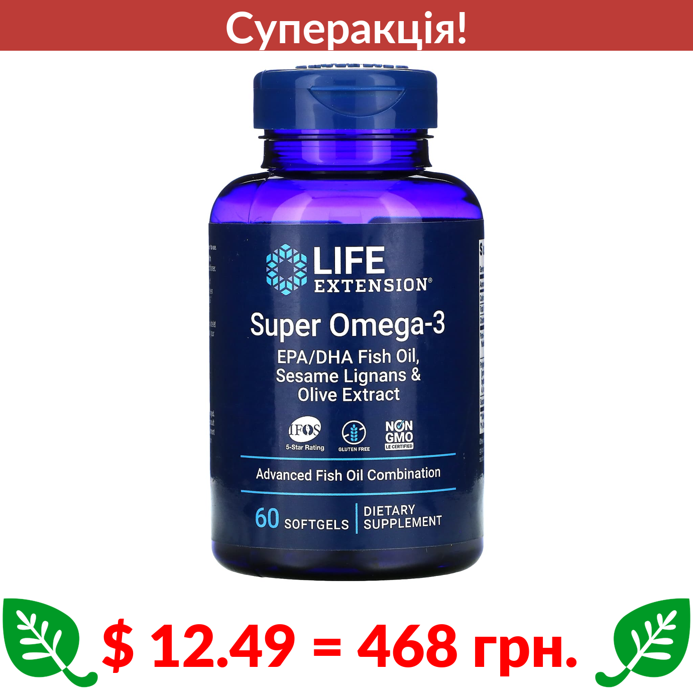 $ 12.49 = 468 грн. ???? cуперакція! ???? Life Extension, Ультра омега-3, 60 капсул