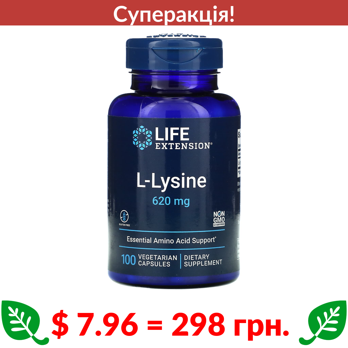 $ 7.96 = 298 грн. ???? cуперакція! ???? Life Extension, L-лізин, 620 мг, 100 вегетаріанських капсул