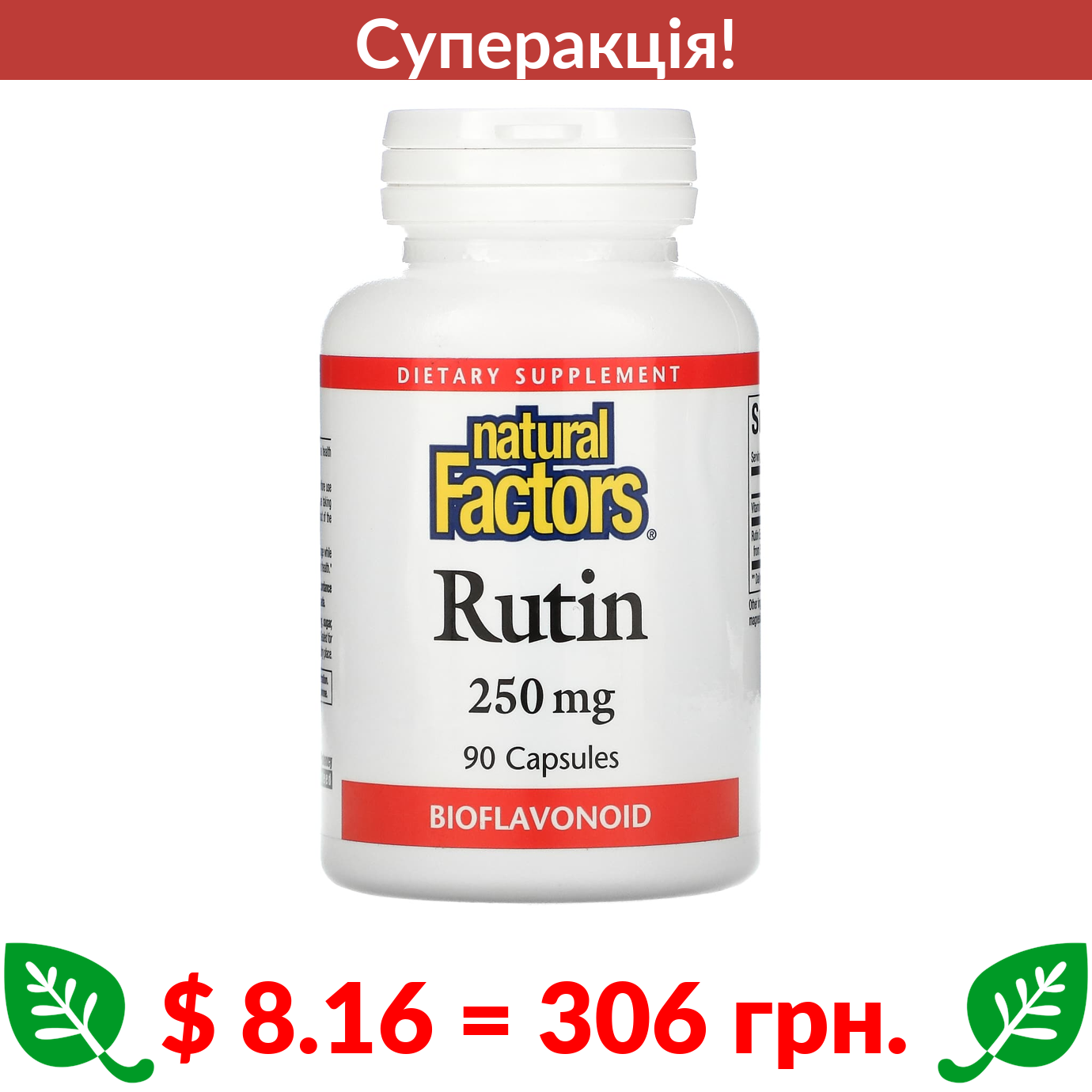 $ 8.16 = 306 грн. ???? cуперакція! ???? Natural Factors, рутин, 250 мг, 90 капсул