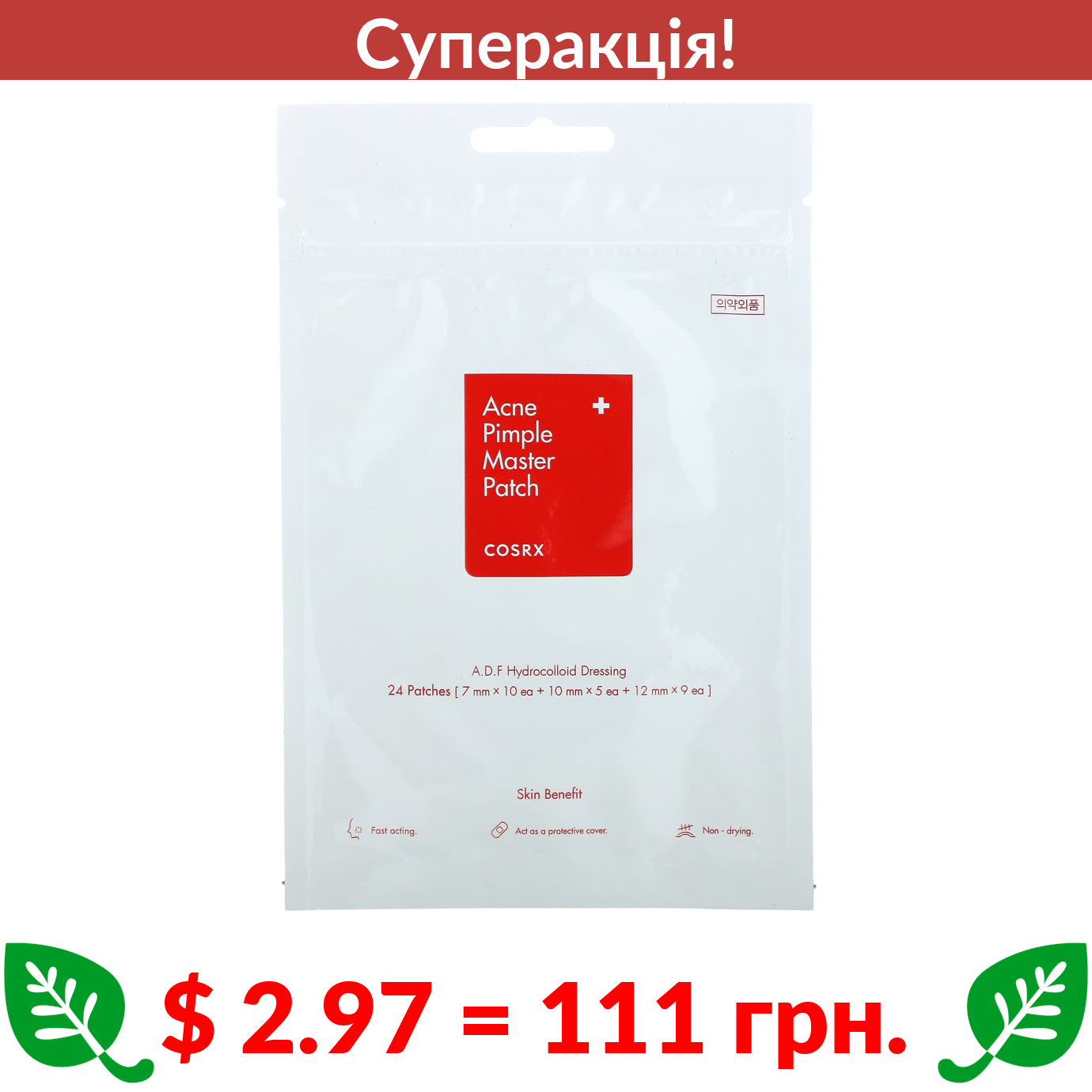 $ 2.97 = 111 грн. ???? cуперакція! ???? CosRx, Master Patch, протизапальні патчі від акне, 24 патчі