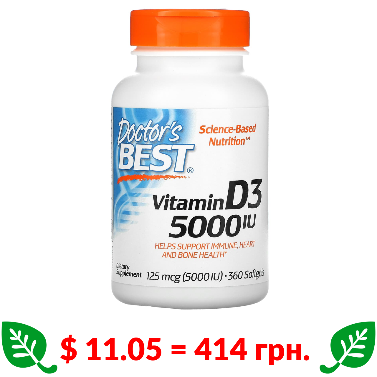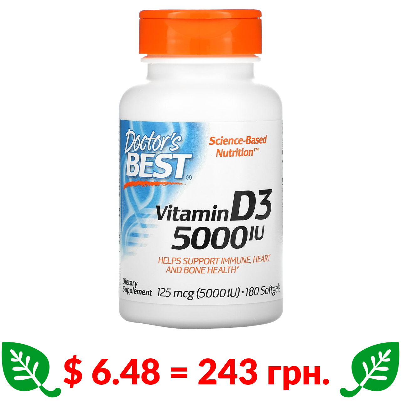 $ 6.48 = 243 грн. Doctor’s Best, вітамін D3, 125 мкг (5000 МО), 180 капсул