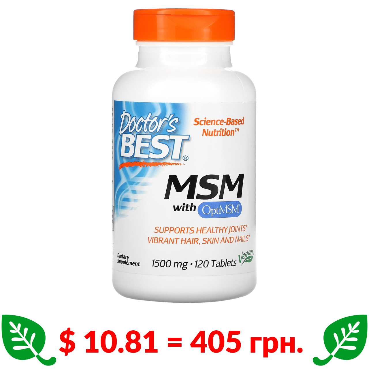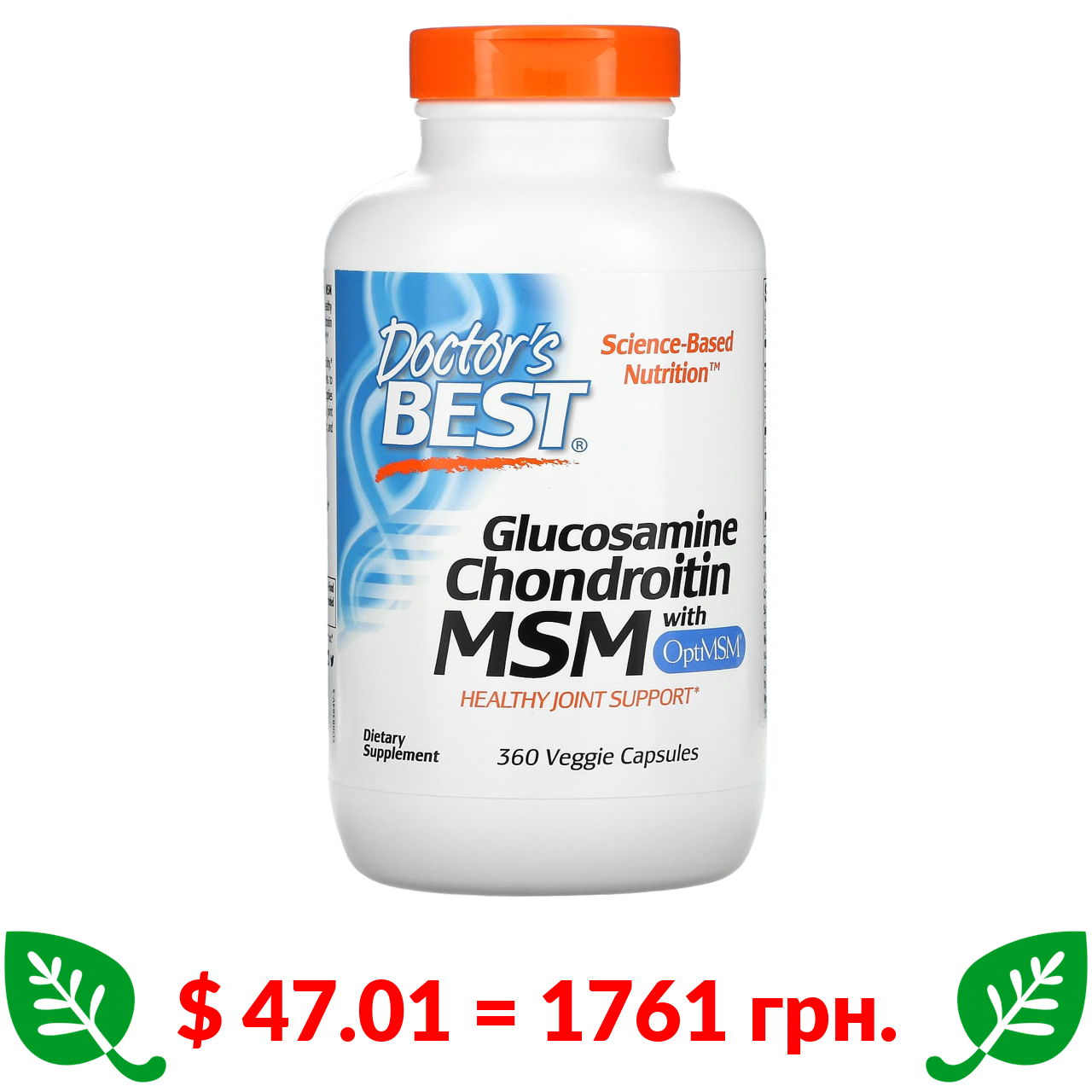 $ 18.76 = 703 грн. Doctor’s Best, глюкозамін, хондроїтин та МСМ з OptiMSM, 120 рослинних капсул