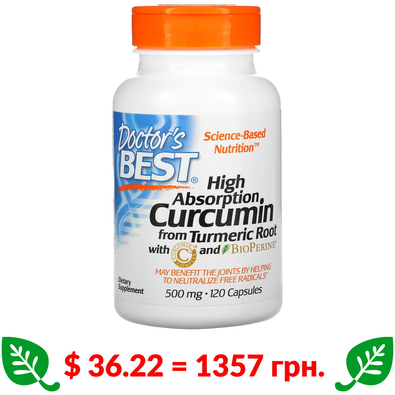 $ 36.22 = 1357 грн. Doctor’s Best, легкозасвоюваний куркумін, 500 мг, 120 капсул