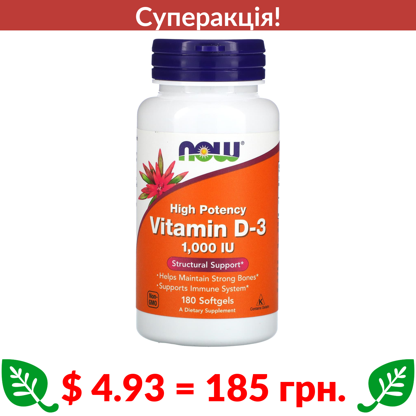 $ 4.4 = 165 грн. ???? cуперакція! ???? Now Foods, високоефективний вітамін D3, 50 мкг (2000 МО), 120 капсул