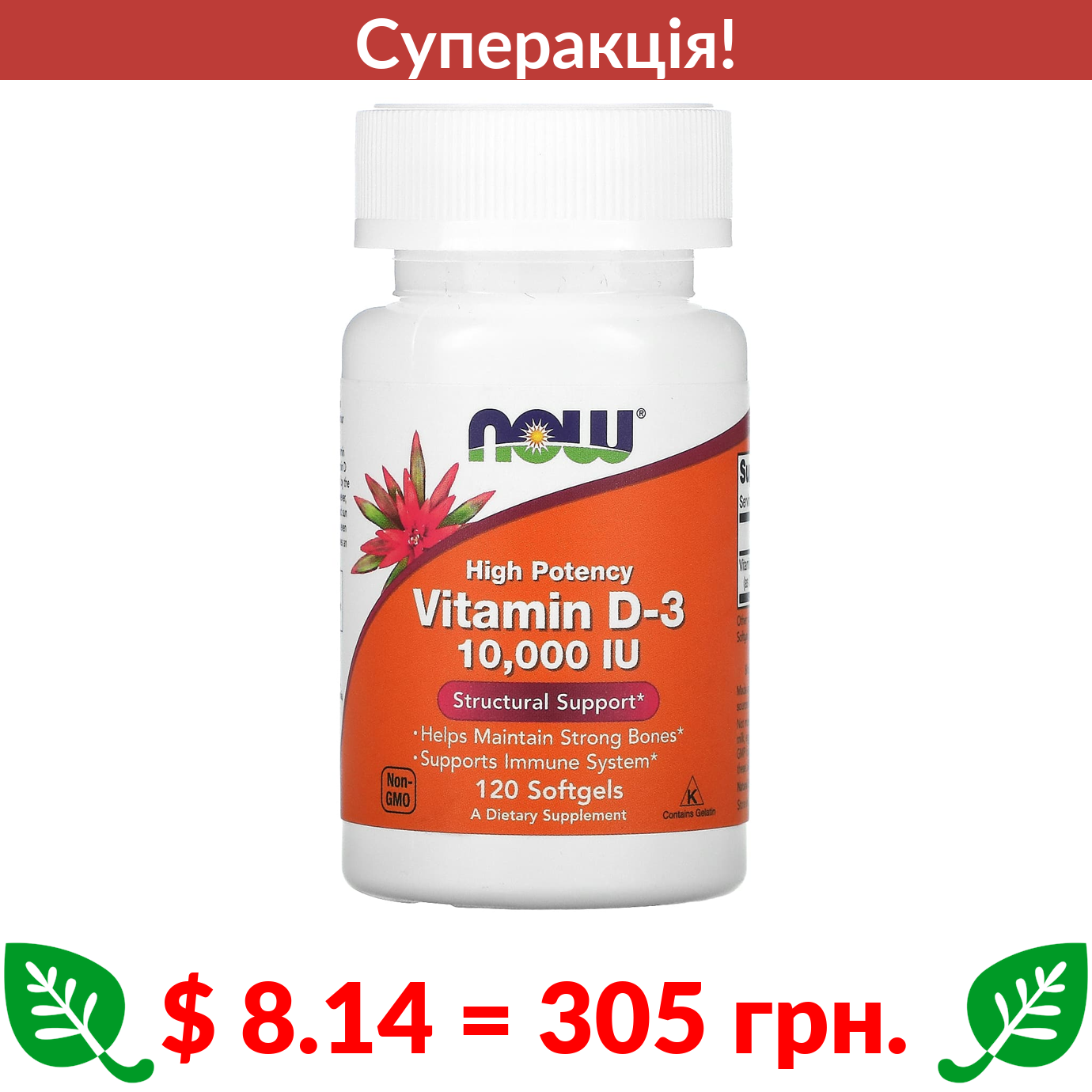 $ 8.14 = 305 грн. ???? cуперакція! ???? Now Foods, високоефективний вітамін D3, 250 мкг (10 000 МО), 120 капсул