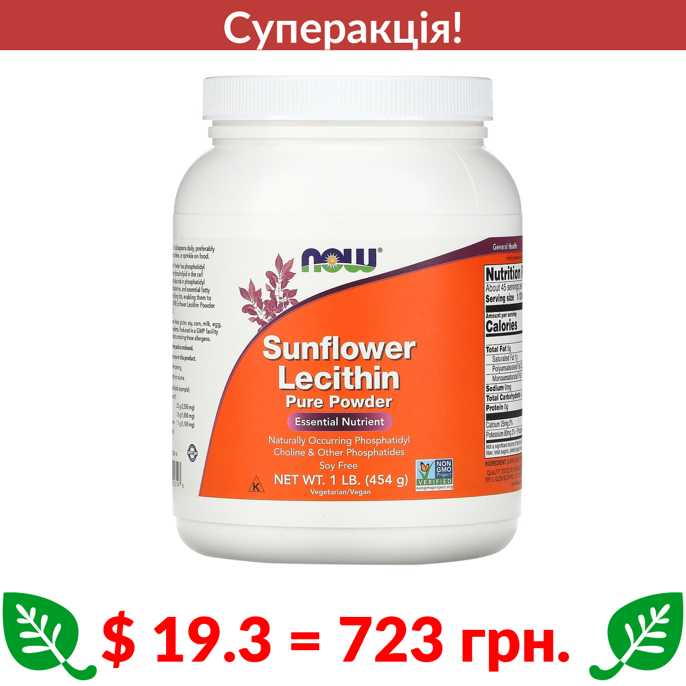 $ 19.3 = 723 грн. ???? cуперакція! ???? Now Foods, Соняшниковий лецитин, чистий порошок, 454 г (1 фунт)