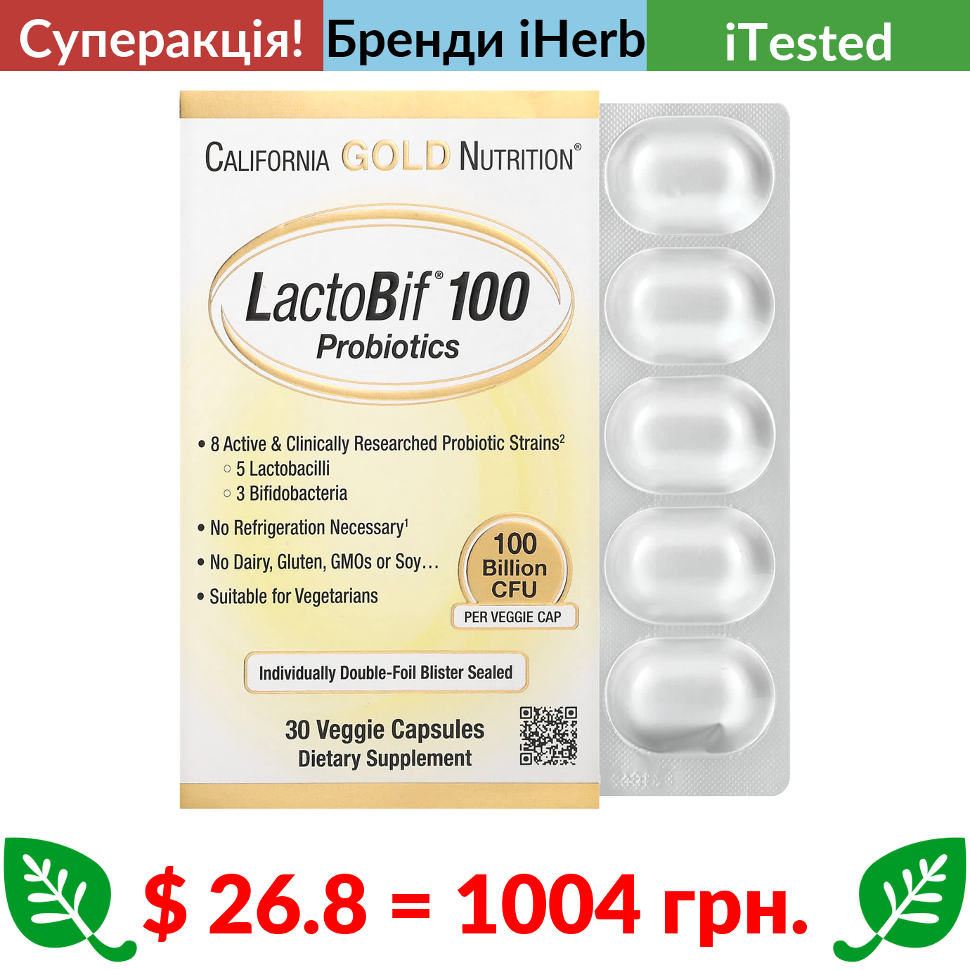 $ 26.8 = 1004 грн. ???? cуперакція! ???? California Gold Nutrition, LactoBif, пробіотики, 100 млрд КУО, 30 рослинних капсул