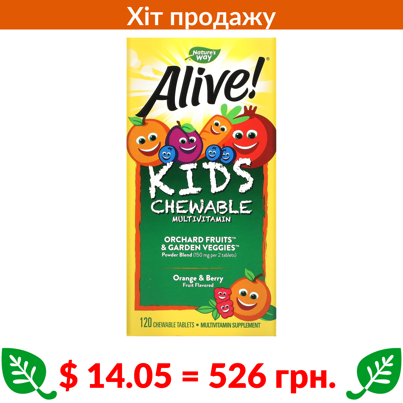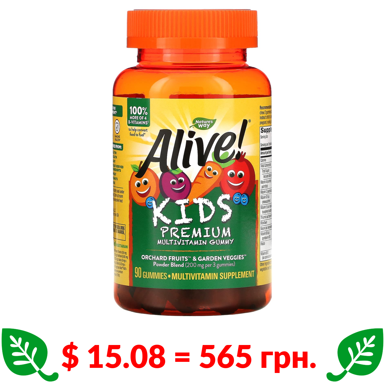 $ 15.08 = 565 грн. ????️ у кошику ????️ Nature’s Way, Alive!, мультивітаміни преміальної якості для дітей, вишня, апельсин і виноград, 90 жувальних таблеток