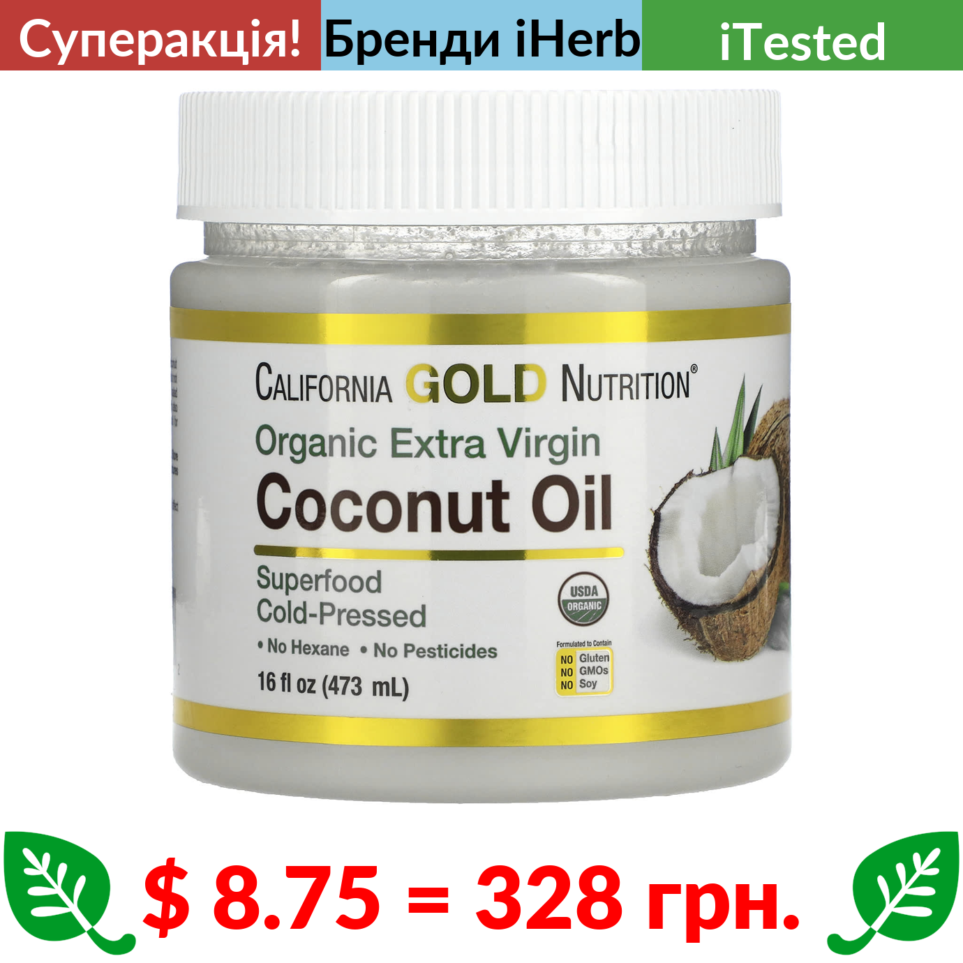 $ 8.75 = 328 грн. ???? cуперакція! ???? California Gold Nutrition, SUPERFOODS, органічна нерафінована кокосова олія першого холодного віджиму, 473 мл (16 рідк. унцій)