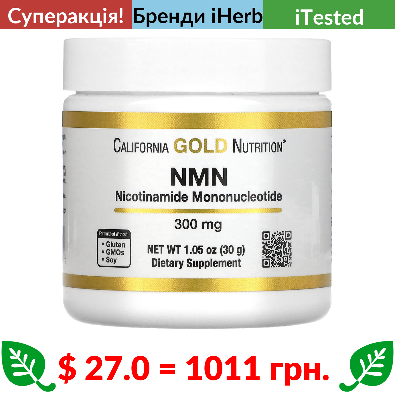 $ 27.0 = 1011 грн. ???? cуперакція! ???? California Gold Nutrition, Порошок NMN, 300 мг, 30 г (1,05 унції)