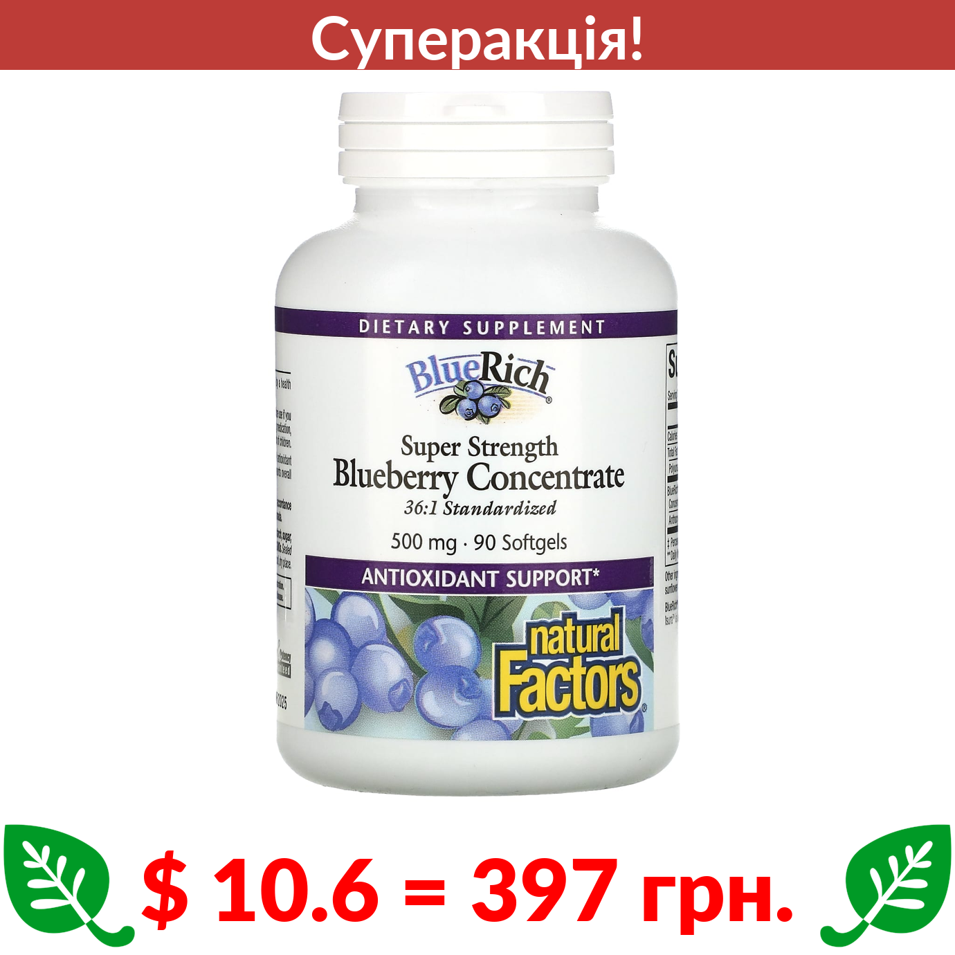 $ 10.6 = 397 грн. ???? cуперакція! ???? Natural Factors, BlueRich, Super Strength, концентрат лохини, 500 мг, 90 капсул