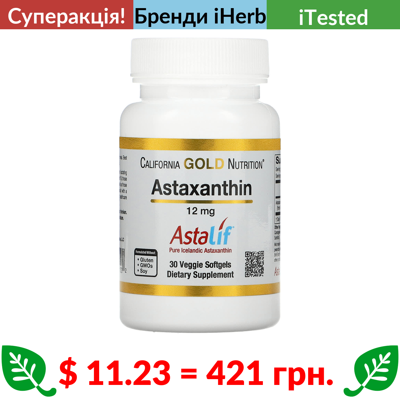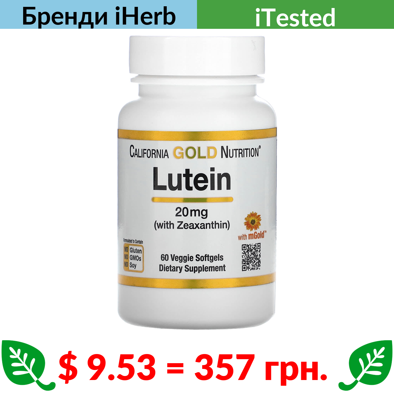 $ 9.53 = 357 грн. California Gold Nutrition, лютеїн із зеаксантином, 20 мг, 60 вегетаріанських капсул