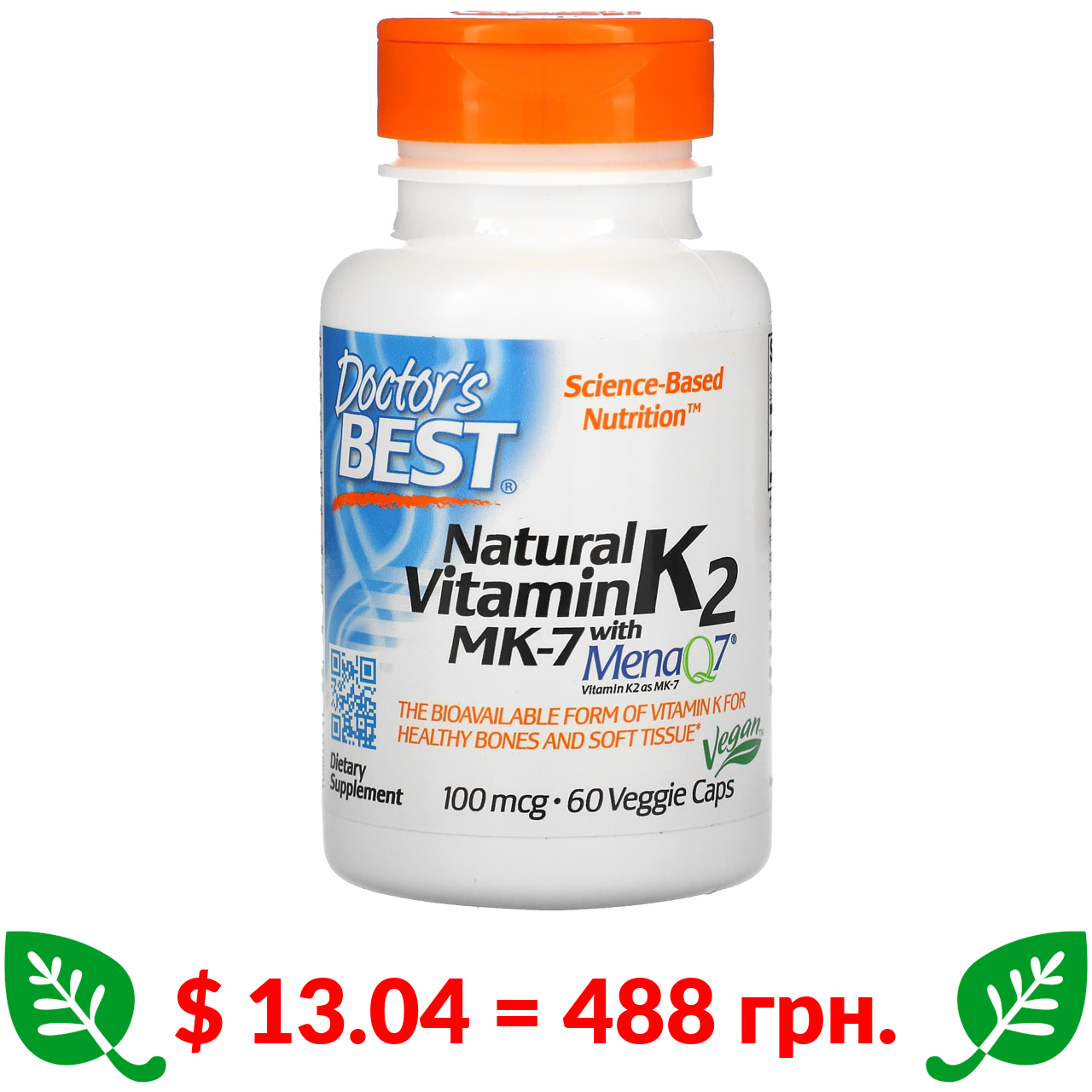 $ 13.04 = 488 грн. Doctor’s Best, натуральний вітамін К2 МК-7 з MenaQ7, 100 мкг, 60 рослинних капсул