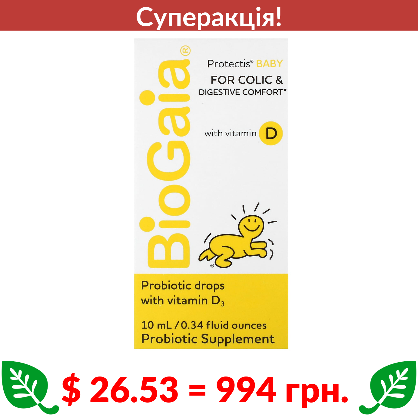 $ 26.53 = 994 грн. ???? cуперакція! ???? BioGaia, Protectis Baby, пробітичні краплі з вітаміном D для дітей, 10 мл (0,34 рідк. унції)