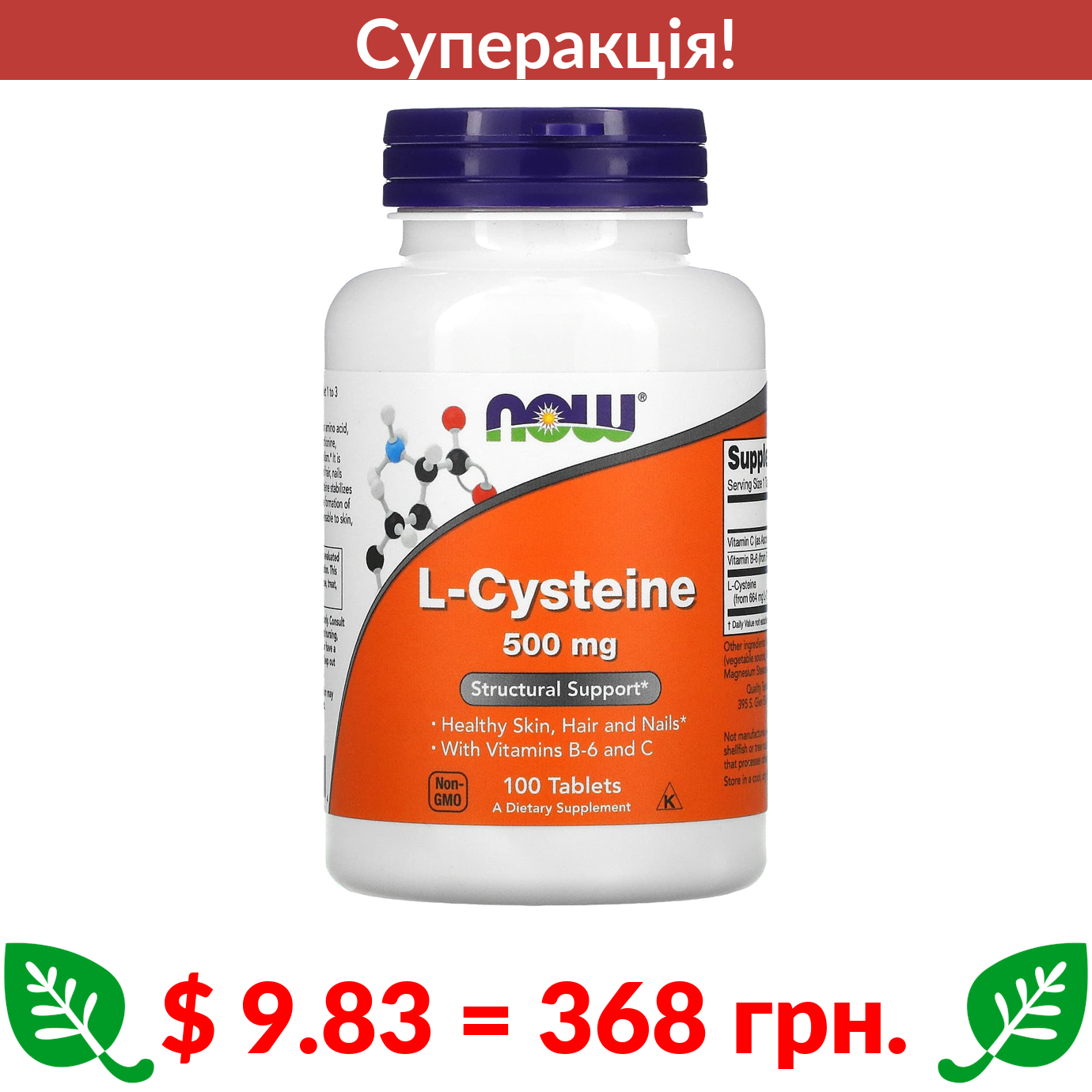 $ 9.83 = 368 грн. ???? cуперакція! ???? Now Foods, L-цистеїн, 500 мг, 100 таблеток