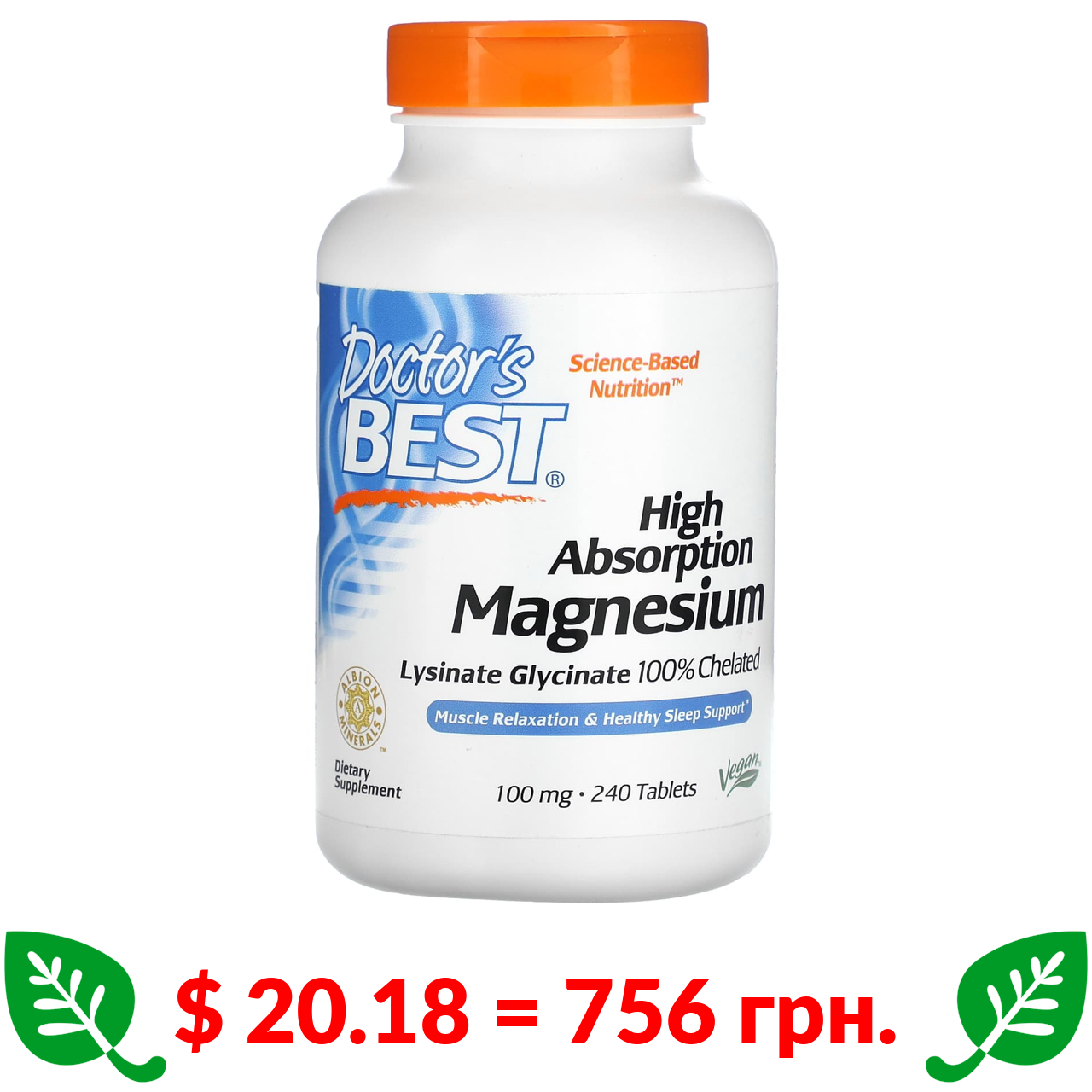 $ 20.18 = 756 грн. Doctor’s Best, повністю хелатований легко засвоюваний магній з Albion Minerals, 100 мг, 240 таблеток