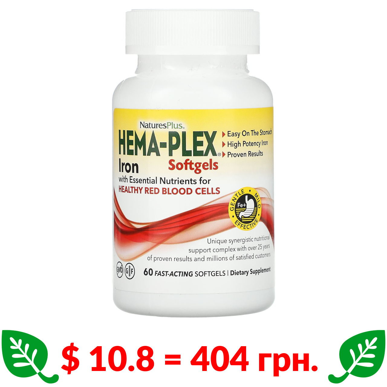 $ 10.8 = 404 грн. Nature’s Plus, Hema-Plex, 60 швидкодіючих капсул