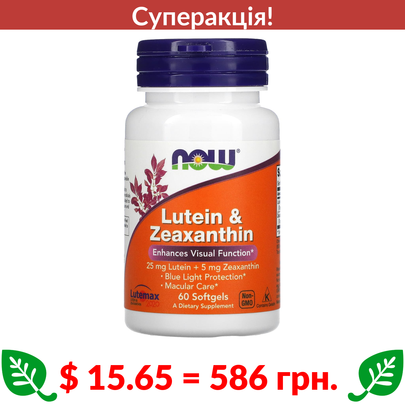 $ 15.65 = 586 грн. ???? cуперакція! ???? Now Foods, лютеїн і зеаксантин, 60 капсул