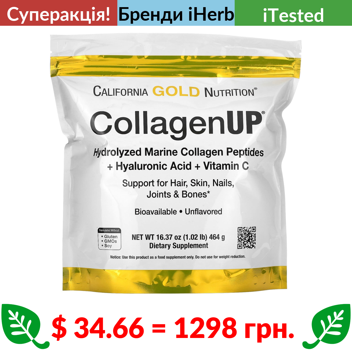$ 34.66 = 1298 грн. ???? cуперакція! ???? California Gold Nutrition, CollagenUP, гідролізовані пептиди морського колагену з гіалуроновою кислотою та вітаміном C, без ароматизаторів, 464 г (16,37 унції)